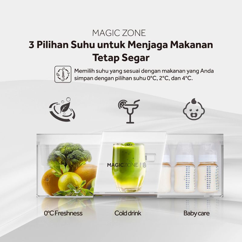 Produk ini memiliki fitur "Magic Zone" pada suhu 0 hingga 4 derajat Celcius, Anda dapat memastikan makanan Anda tetap segar dan aman untuk dikonsumsi. Suhu ini ideal untuk menyimpan berbagai jenis makanan, mulai dari susu asi yang membutuhkan pendinginan tepat untuk mempertahankan nutrisi hingga buah dan sayuran yang membutuhkan lingkungan yang dingin untuk memperlambat proses pembusukan.