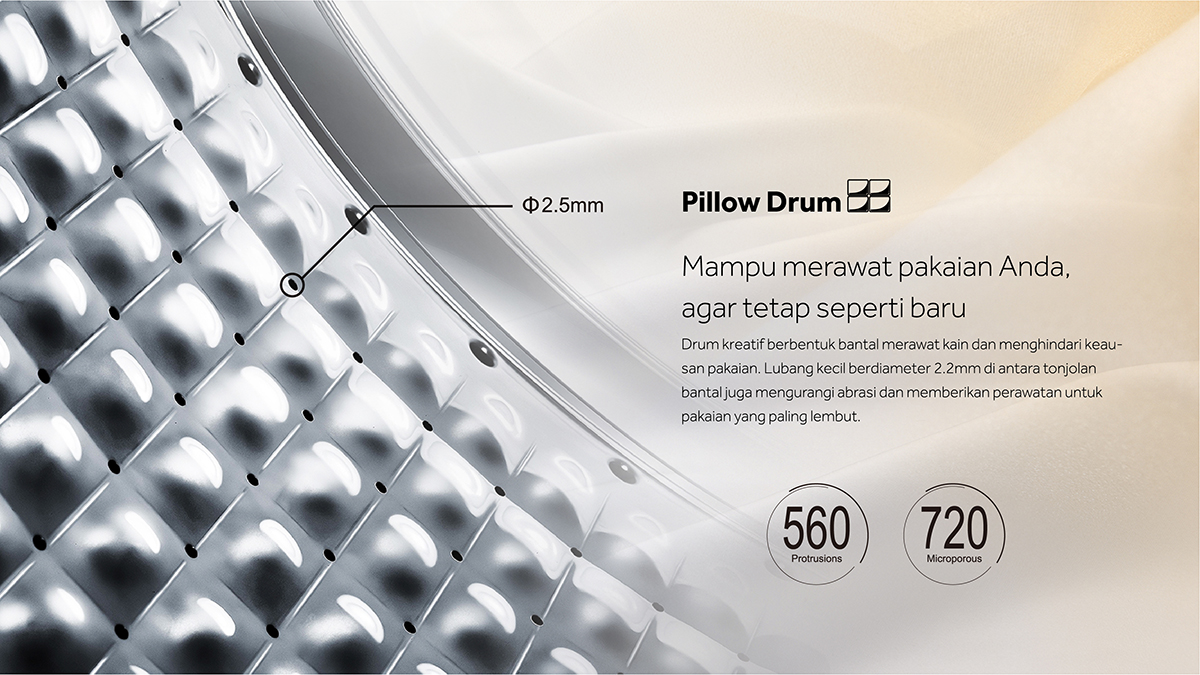 Drum kreatif berbentuk bantal merawat kain dan menghindari keausan pakaian. Lubang kecil berdiameter 2.2mm di antara tonjolan bantal juga mengurangi abrasi dan memberikan perawatan untuk pakaian yang paling lembut.