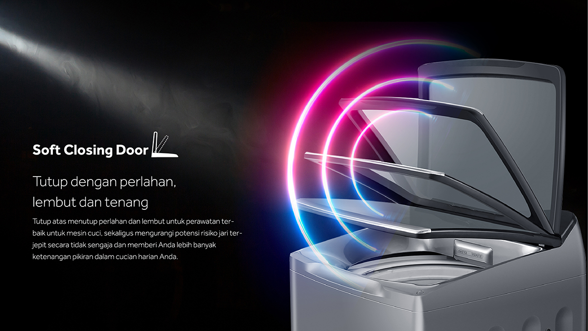 Tutup atas menutup perlahan dan lembut untuk perawatan terbaik untuk mesin cuci, sekaligus mengurangi potensi risiko jari terjepit secara tidak sengaja dan memberi Anda lebih banyak ketenangan pikiran dalam cucian harian Anda.