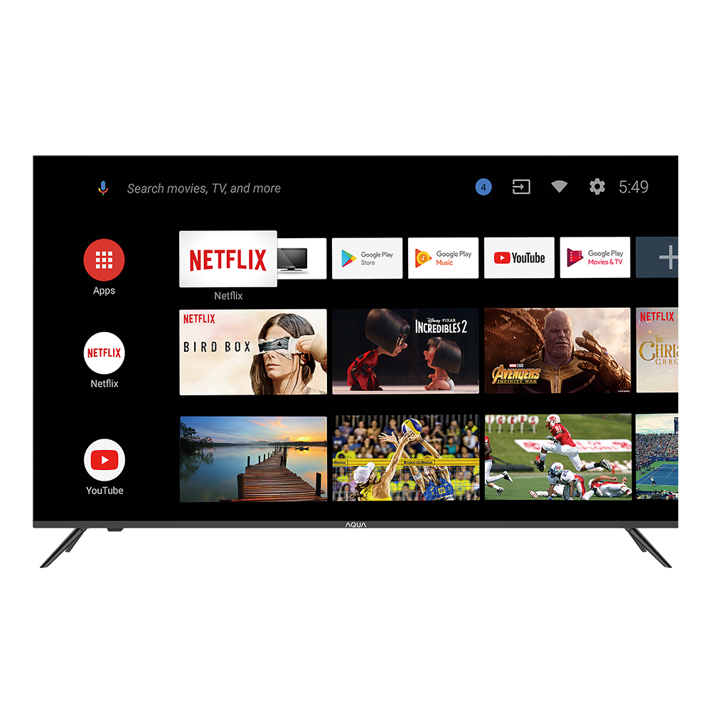 Televisi AQT32K701A memiliki fiture Android TV, Full HD, Android Device IoT Hub, Intelligent Voice Control, Bezel Less.