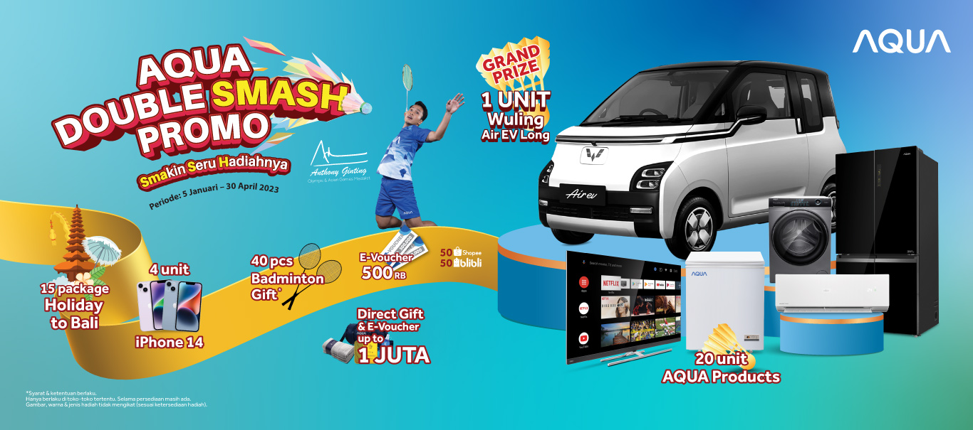Jangan lewatkan kesempatan terakhir Anda! Beli produk AQUA Elektronik favorit Anda di official store AQUA Elektronik terdekat untuk mendapatkan kode kupon agar bisa mengikuti pengundian promo AQUA Double SMASH berikutnya.